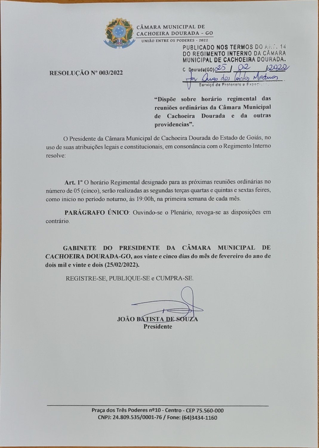 Com os votos dos 8 Vereadores(as) presentes, o Projeto de Resolução nº 003/2022 foi aprovado na sessão passada e alterou o horário das sessões ordinárias da Câmara Municipal de Cachoeira Dourada - GO para às 19h.